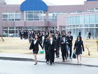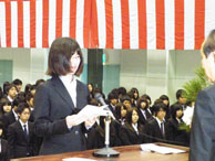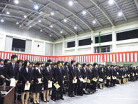 また、在学生を代表して情報システム学科3年生の佐藤翔さんは「積極性と柔軟性を身に付け、大学4年間で自己を確立してください」と歓迎の言葉を述べました。これに対し、新入生代表の寳輪新菜さんが、「経験豊かな先生方からご指導をいただきながら、先輩方や周りの仲間と助言し合い、真剣に学んでいきたい」と抱負を述べました。最後は、出席者全員が校歌を斉唱して式典を終了しました。