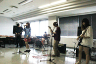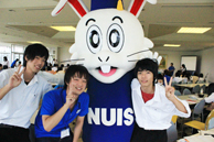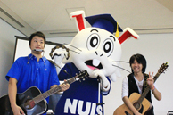 その他、入学試験の説明会、参加者が気軽に立ち寄れる入試・就職の個別相談コーナーが設置され、入試情報や奨学金、就職状況等について、参加者は熱心に質問をしていました。海外留学相談コーナーでは、本学の特色の1つである派遣留学制度・夏期セミナー(アメリカ・ロシア・中国・韓国・カナダ)で実際に留学を体験した学生から、制度の特色や海外生活の体験談が語られました。また、公認団体(部活・サークル)紹介では、軽音楽部が223教室にてバンド演奏を披露しました。さらに、特別ゲストとして、UX新潟テレビ21のインターネットTV「レクスタTV」に出演中の「ぽこぴー」が7月に引き続き、学生食堂「弥彦」にて演奏やトークを披露、そして、本学のマスコットキャラクターのナビット君も登場し、「ぽこぴー」や軽音楽部と共演したりなど、参加者をそれぞれ楽しませていました。