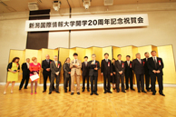 また、記念式典終了後、引き続き記念祝賀会を開催しました。祝賀会に先立ち、本学合唱部による校歌斉唱が行われたり、祝賀会の席上では、ロシア、中国、韓国、アメリカ、カナダの各提携大学の代表者から祝意が述べられました。また、乾杯後には、情報システム学科の藤田教授らによる舞囃子が披露されるなど、会場は大いに盛り上がりを見せていました。