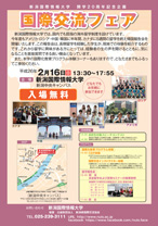 本学では、開学20周年を記念し、「国際交流フェア」を平成26年2月16日(日)新潟市中央区の新潟中央キャンパスにて開催いたします。当日は、留学生による帰国報告会のほか、CEP(本学独自の英語教育プログラム)体験、国際交流インストラクター体験などの国際化教育プログラム体験コーナーもあります。また、同会場にて高校生対象スピーチコンテストも開催されます。入場無料ですので、皆様ふるってご参加ください。