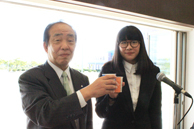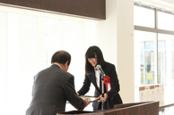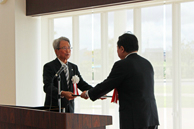 また、「福田・丸運特定共同企業体」を代表して、(株)福田組代表取締役会長の福田 勝之 氏に星野理事長から感謝状が、そして、平山学長からMELF(学生会館名称:Making Everlasting Friends)の命名者である国際学部 国際文化学科1年 木下 晴香さんに表彰状がそれぞれ贈呈されました。