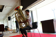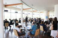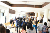 午後から行われた「開館式」には、学生・教職員を含む約150名が参加しました。平山学長、上西園館長(学生部長)、大沼学友会会長の挨拶の後、命名者の木下晴香さんの紹介と乾杯の音頭がありました。軽音楽部や吹奏楽部による演奏も行われ、参加者は耳を傾けながら飲み物やケーキを手に、全員で学生会館の完成を祝いました。