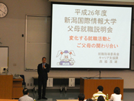 平成26年10月4日(土)本校(みずき野キャンパス)にて、3年次保護者向け「父母就職説明会」を開催し、約60名のご父母の方々からご参加いただきました。この取り組みは、就職活動を控えた3年次生保護者を対象に毎年開催しています。