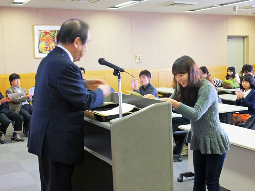 平成26年度資格取得奨励奨学金授与式(後期)を平成26年12月18日(木)本校(みずき野キャンパス)で開催しました。6月に行われた資格取得奨励奨学金授与式(前期)に引き続き、今年度2回目の授与式となりました。今回対象となった学生は、TOEICなどの語学、情報処理関係、ファイナンシャルプランニング技能検定、マイクロソフトオフィススペシャリスト(MOS)検定等の資格取得者です。