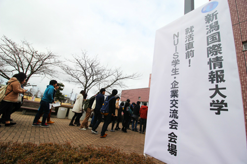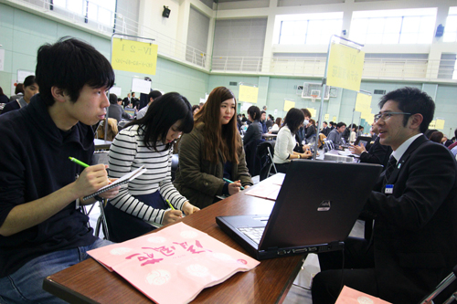 平成27年2月4日(水)、5日(木)の両日、本校(みずき野キャンパス)体育館にて「平成26年度 就活直前!NUIS学生・企業交流会」を開催しました。交流会では、本学学生が企業研究・業界研究を進め、できるだけ多くの業界や企業に触れることで職業選択の視野を広げ、企業の人事担当の皆様とのコミュニケーションを図り、在学生は社会人と話すことへの抵抗感の払拭、企業の方々におかれましては、学生一人ひとりの個性や本質を知っていただけた会になったと思います。