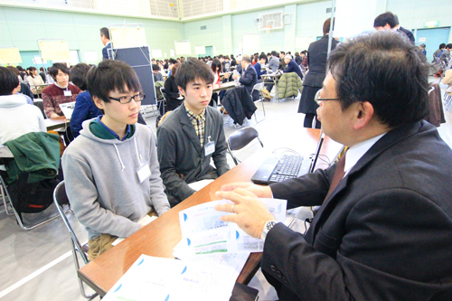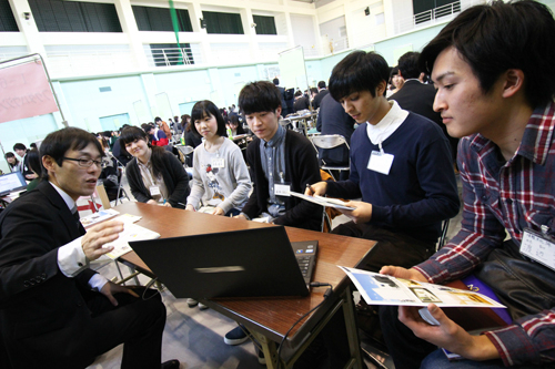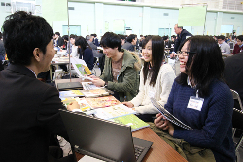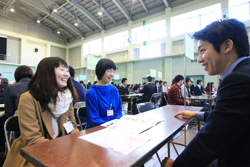 景気が回復傾向にある中、会の当日は県内外より2日間で192社の団体・企業人事担当の方々にご参加いただきました。在学生は241名が参加し、企業・団体様を5グループに分け、ブース形式で一定の時間内で自己紹介および企業・団体様と交流を図りました。2日間で一人最低20社のブースを訪問し、3月採用選考の広報活動解禁に向けて円滑な就職活動ができるように業界理解を深めていました。