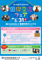 本学では、「国際交流フェア」を平成27年5月31日(日)新潟市中央区の新潟中央キャンパスにて開催いたします。当日は、留学生による帰国報告会のほか、第1回新潟県高校生英語スピーチコンテストも行います。入場無料ですので、皆様ふるってご参加ください。