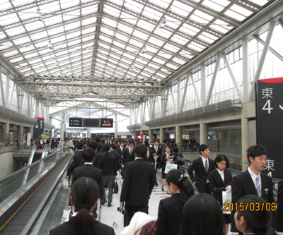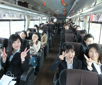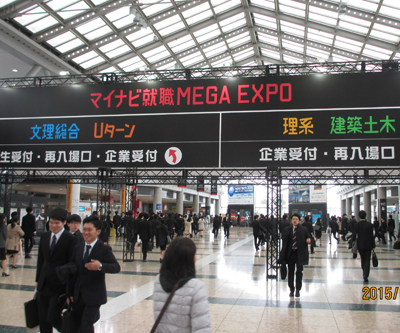 平成27年3月8日(日) 東京就活バスツアーin東京ビッグサイトを開催いたしました。 『マイナビ就職EXPO in東京ビッグサイト(マイナビ主催)』の合同企業説明会に参加し、総勢56名の学生は、新潟の合同説明会とは比較できないくらい大規模なイベントに臆することなく、志望する企業のブースに積極的にまわり、真剣に採用担当者の説明に聞き入りました。学生にとって収穫の多い貴重な経験となりました。