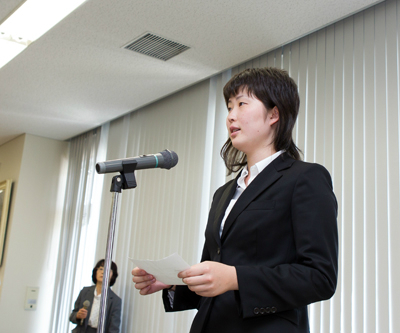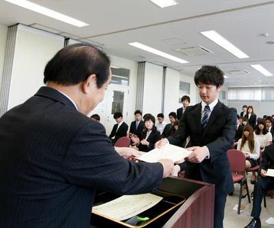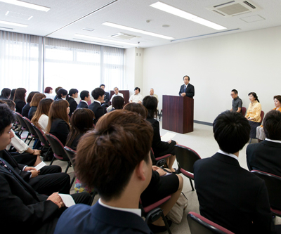 奨学金授与式は国際交流センターで行われ、各コースの担当教員が一人ひとり名前を読み上げ、平山 征夫学長がコースの代表者に奨学金授与証書を授与しました。引き続き、壮行パーティーが行われ、学生たちは、和やかな雰囲気の中で歓談し、学長、学部長をはじめ関係教員から激励を受けていました。また、各コースの代表者から決意表明があり、留学への期待と意気込みが披露されるなど、活気あふれるパーティーとなりました。