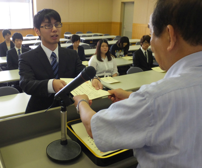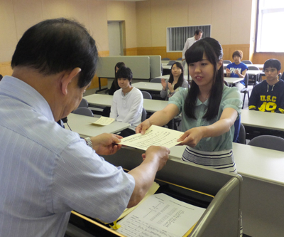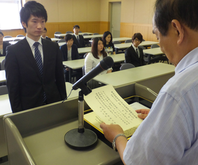 平成27年7月9日(木)本校(みずき野キャンパス)にて、「平成27年度表彰奨学金授与式」を開催しました。表彰奨学金は、学業成績優秀者(前年度の学業成績が各学年・学科において優秀であった者)及び課外活動功労者(課外活動等において顕著な業績をあげた者または団体)に対し、授与するものです。当日は、平山 征夫 学長から授与者一人ひとりに奨学金授与証書が手渡された後、激励の言葉が贈られました。今年度は、学業成績優秀者として17人に、課外活動功労者として7人に奨学金が授与されました。授与された皆さん、大変おめでとうございます。