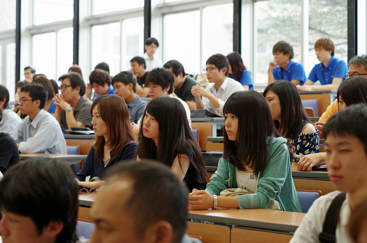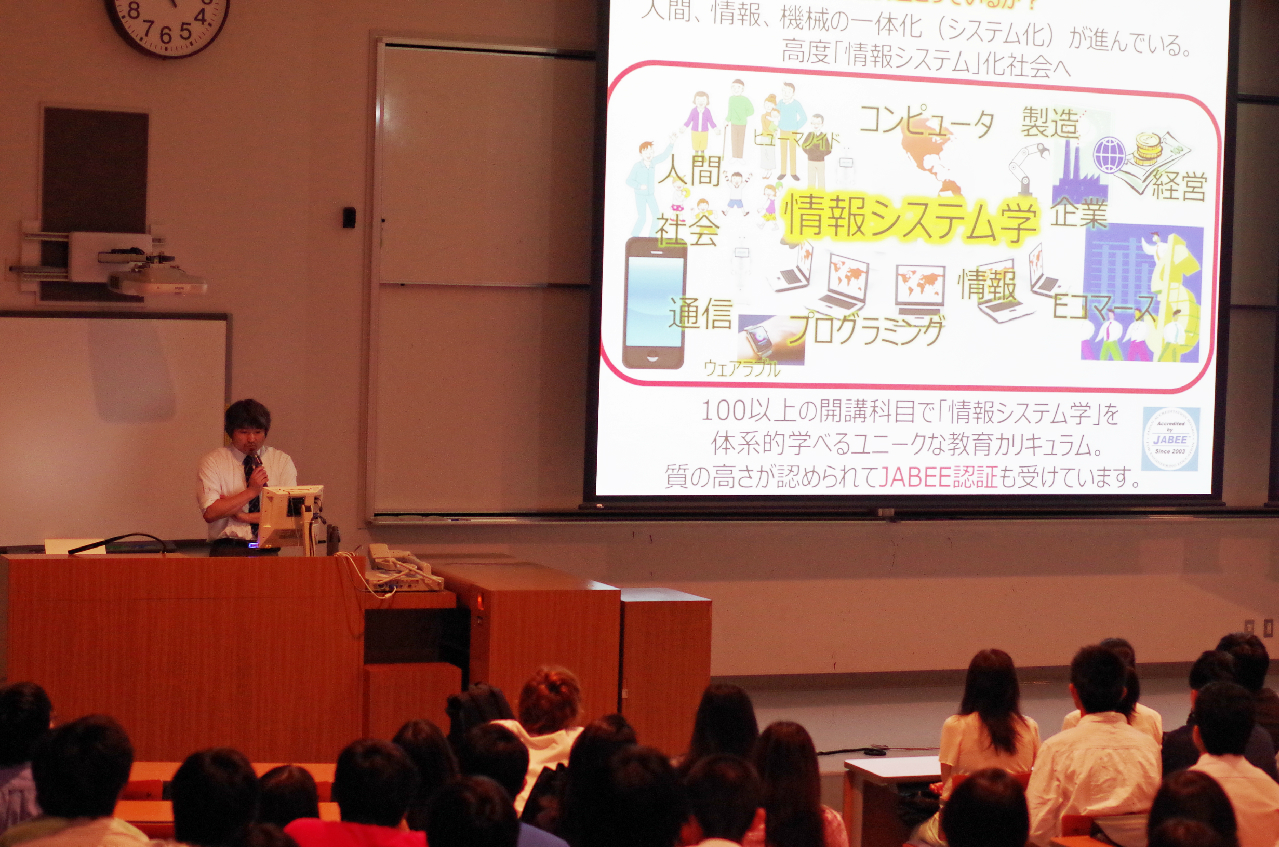 平成27年7月19日(日)本校(みずき野キャンパス)にて、平成27年度第1回オープンキャンパスを開催しました。昨年度に引き続き、今回も十日町、高田、長岡、村上の各方面より無料往復送迎バスが運行され、さらに今年度は加茂、五泉、新津を通る新ルートを追加し、多くの参加者の方々にご利用いただきました。当日は、約300名の高校生や保護者の方々からご参加いただき、本学学生が参加者を一日サポートし、模擬講義やキャンパスツアーなど、様々な内容を案内しました。平山 征夫 学長の挨拶に始まり、教員及び学生による学部・学科説明が行なわれた後、模擬講義や実習体験が行われました。語学体験(英語・ロシア語・中国語・韓国語)や「ビジネスゲームを体験」「コンピュータ・シミュレーション演習」などの講義や実習のほか、今年度は『実験体感コーナー』を新設し3Dプリンタやバーチャルリアリティ体験など、参加者にはそれぞれ関心のあるものを選択して大学の講義を体験していただきました。