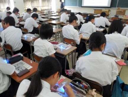 参加した約40名の生徒は実際に光送受信機を製作し、青色LEDを用いた光通信技術や、スマホ等の安心安全な使用法を学びました。