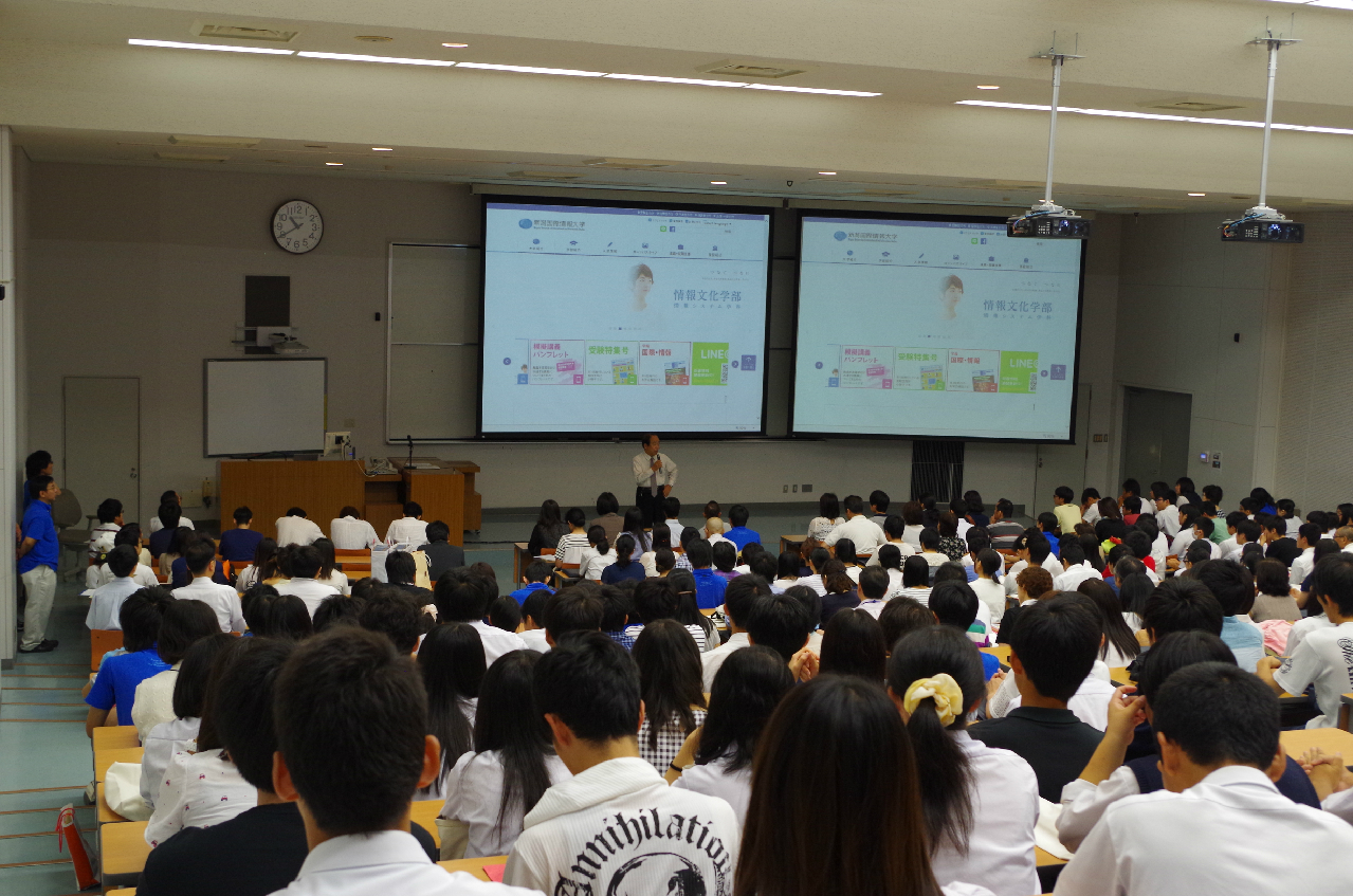 平山 征夫 学長の挨拶に始まり、教員及び学生による学部・学科説明が行なわれた後、模擬講義や実習体験が行われました。語学体験(英語・ロシア語・中国語・韓国語)のほか、模擬講義「AKBシリーズ第3弾!!SKE48の確率分布」「睡眠の科学」、コンピュータ実習「ビジネスゲームを体験!」「オブジェクト指向プログラミングの体験」など、合計11の講義や実習を開講し、参加者にはそれぞれ関心のあるものを選択して大学の講義を体験していただきました。