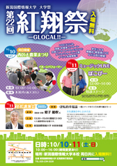 平成27年10月10日(土)・11日(日)の2日間、本校(みずき野キャンパス)にて、第22回「紅翔祭(大学祭)」を下記のとおり開催いたします。テーマは、「-GLOCAL!!-」です。今年も模擬店、文化講演会など楽しいイベントが目白押しとなっております。入場無料ですので、ご家族、ご友人等お誘いのうえ、どなたでもぜひご来学ください。