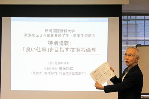 最後に特別講義として、佐藤 国仁 氏(有限会社佐藤R&D代表取締役、一般社団法人技術士PLセンター代表理事)より「『良い仕事』を目指す技術者倫理」というテーマで、中越地震による上越新幹線脱線事故などを例に講演いただきました。