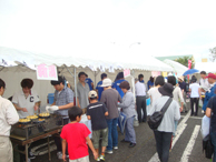 また、小宮山研究室では、西区の剣先焼きを調理・販売をしました。剣先焼きとは、丸型にしたおにぎりをおろし生姜、味噌、砂糖を 合わせたものを塗って焼いたものです。屋台でも食べやすいように「たこ焼き型」に加工したり、広い世代に喜んでもらえるように赤塚の名産の大根づけを1mm角に細かく刻んだものを混ぜ込んだりと、現代風にアレンジして提供しました。当日は天候不順の中、136個もの剣先焼きを売ることが出来ました。8月4日(土)のみずき野祭(みずき野中央公園17時~)、8月25日(土)の佐潟祭(佐潟公園15時~)でも販売を予定しています。