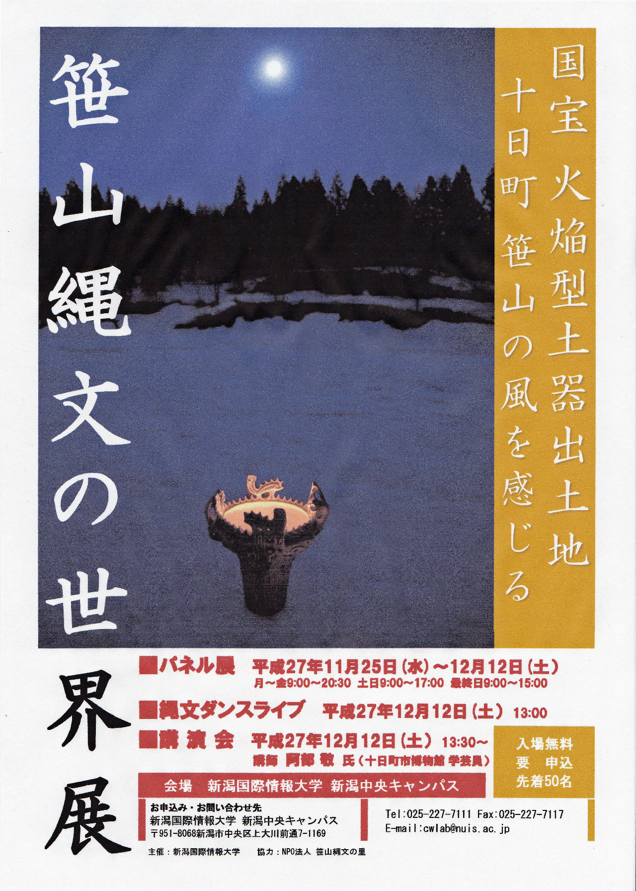 平成27年11月25日(水)~12月12日(土)まで新潟市中央区の本学 新潟中央キャンパスにて、「笹山縄文の世界展」が開催されています。最終日の12月12日(土)には、縄文ダンスライブと十日町市博物館 学芸員 阿部 敬 氏による講演会も開催されます。皆様、ふるってご参加ください。(※終了しました。多数のご参加、ありがとうございました。)