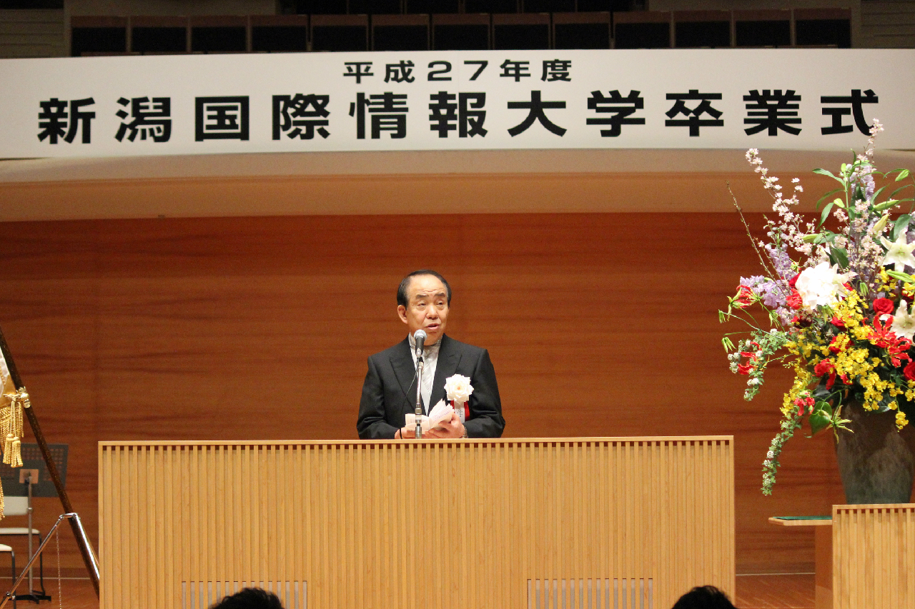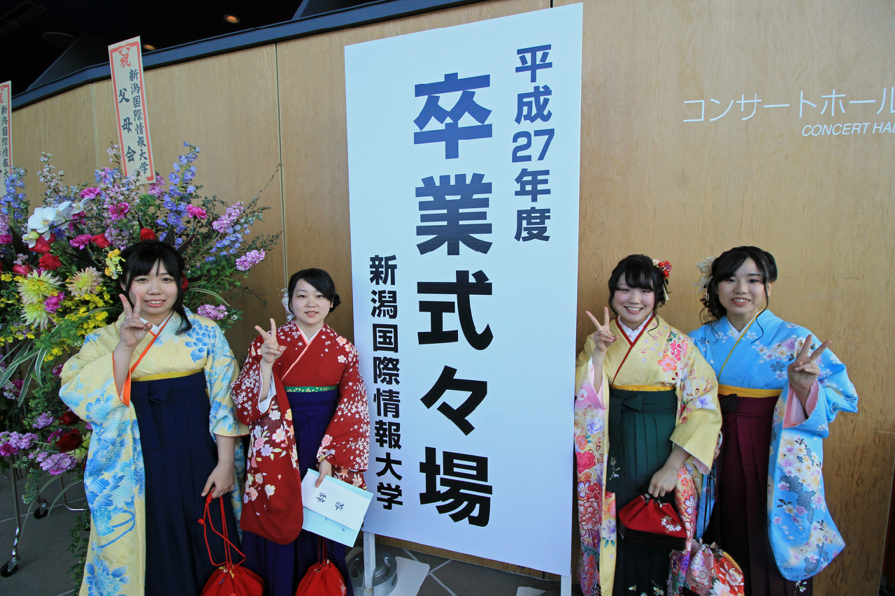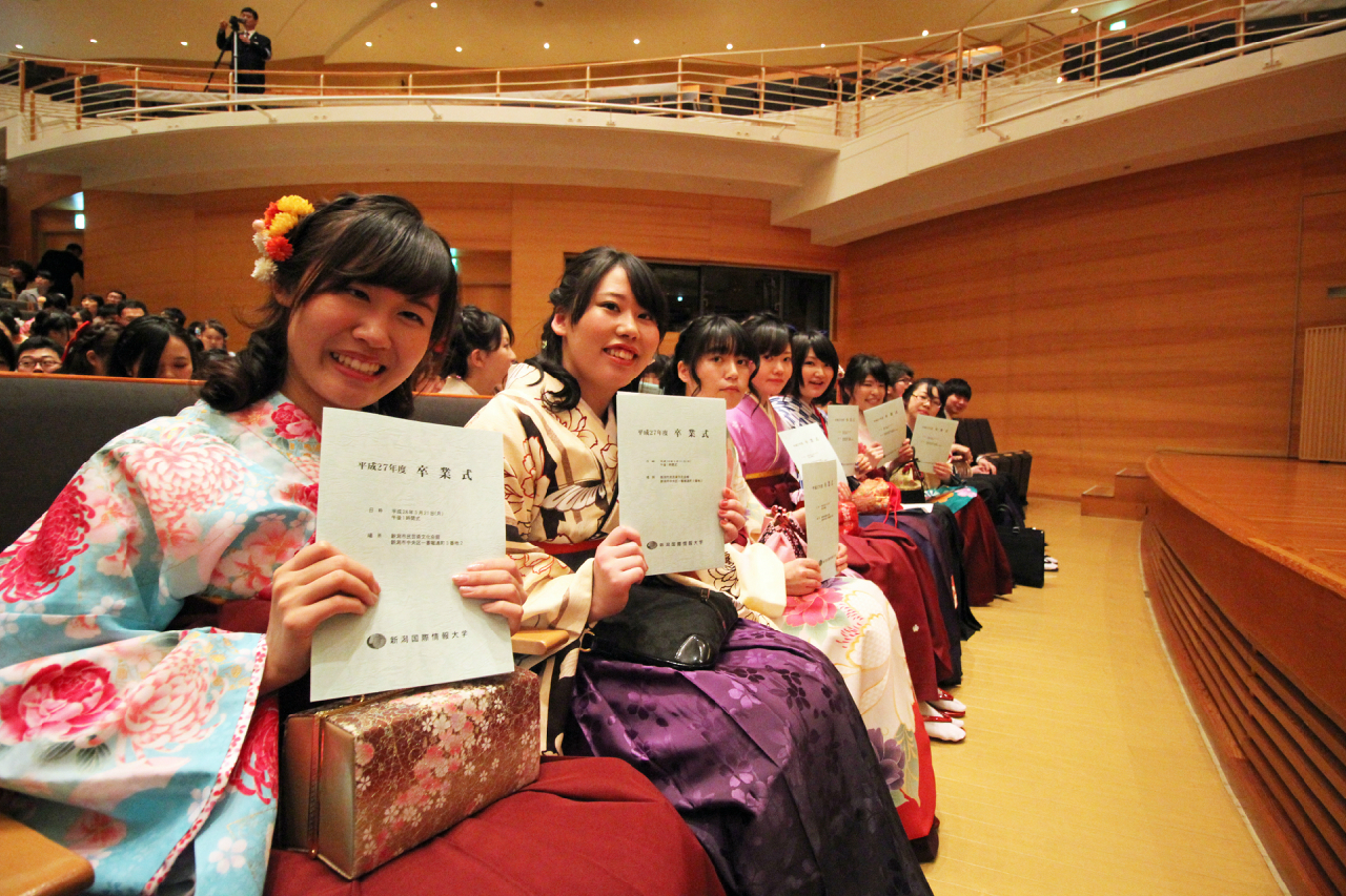 平成28年3月21日(月)新潟市民芸術文化会館(りゅーとぴあ)コンサートホールにて平成27年度(第19回)卒業式を挙行し、263名(情報文化学科121名、情報システム学科142名)の卒業生が、決意を新たに社会へ羽ばたいていきました。