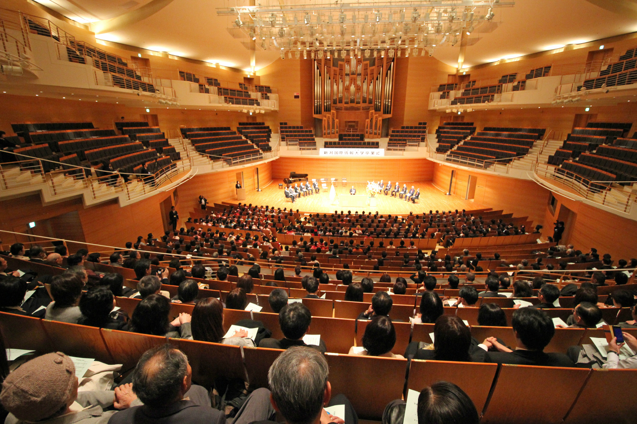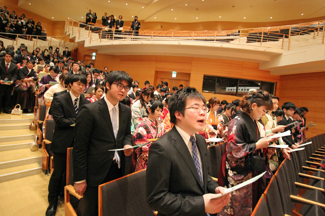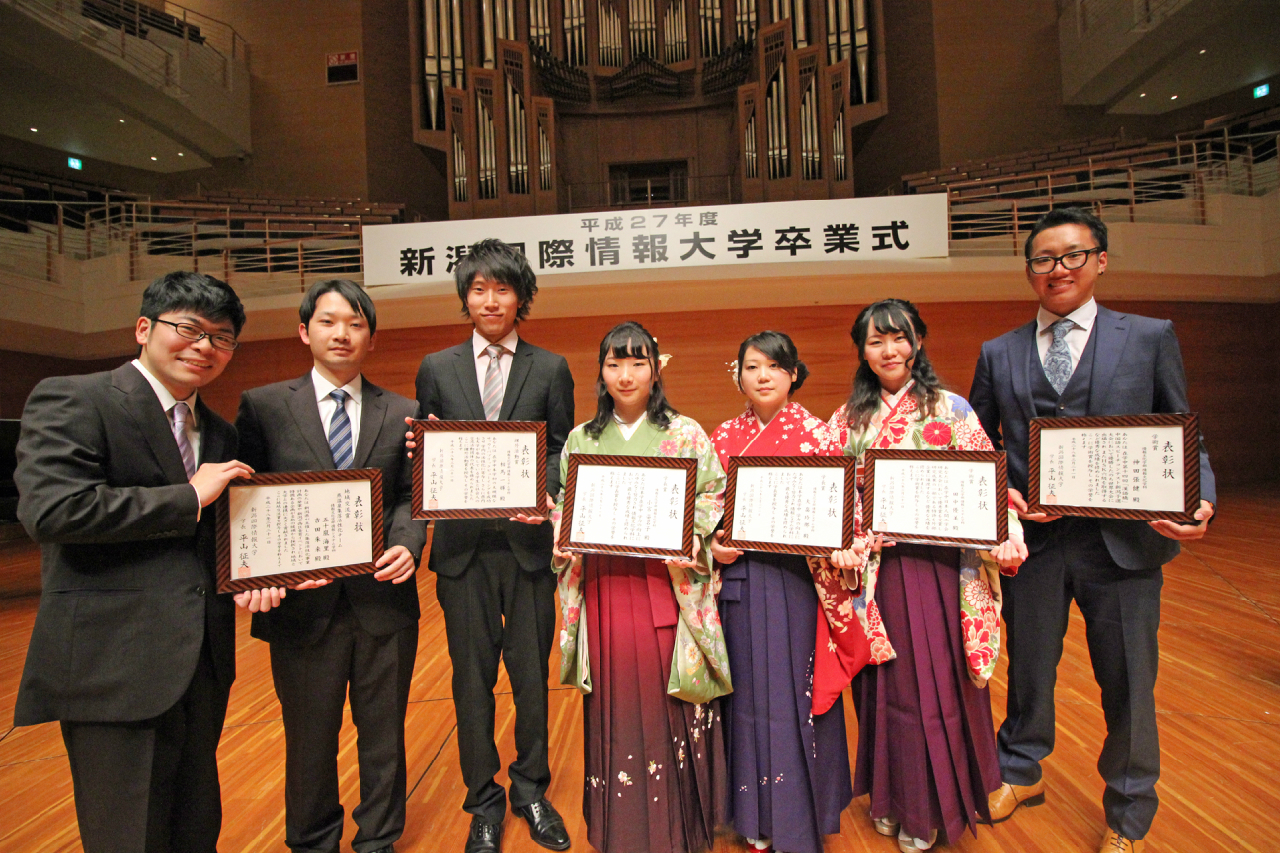 平成28年3月21日(月)新潟市民芸術文化会館(りゅーとぴあ)コンサートホールにて平成27年度(第19回)卒業式を挙行し、263名(情報文化学科121名、情報システム学科142名)の卒業生が、決意を新たに社会へ羽ばたいていきました。