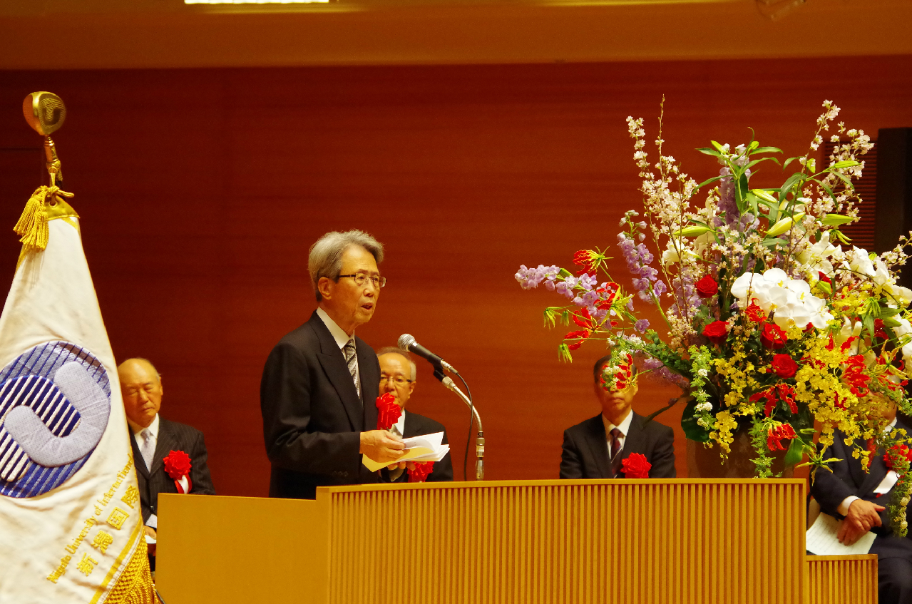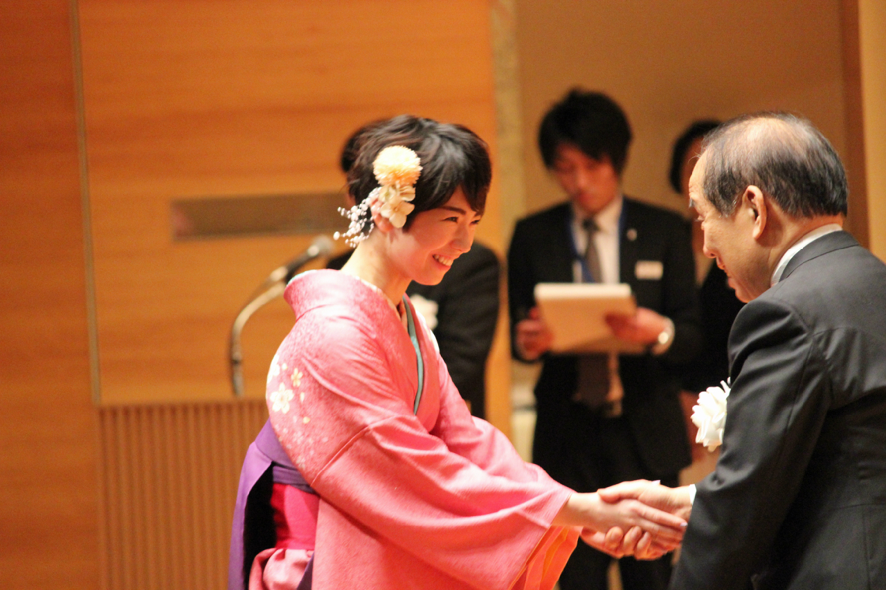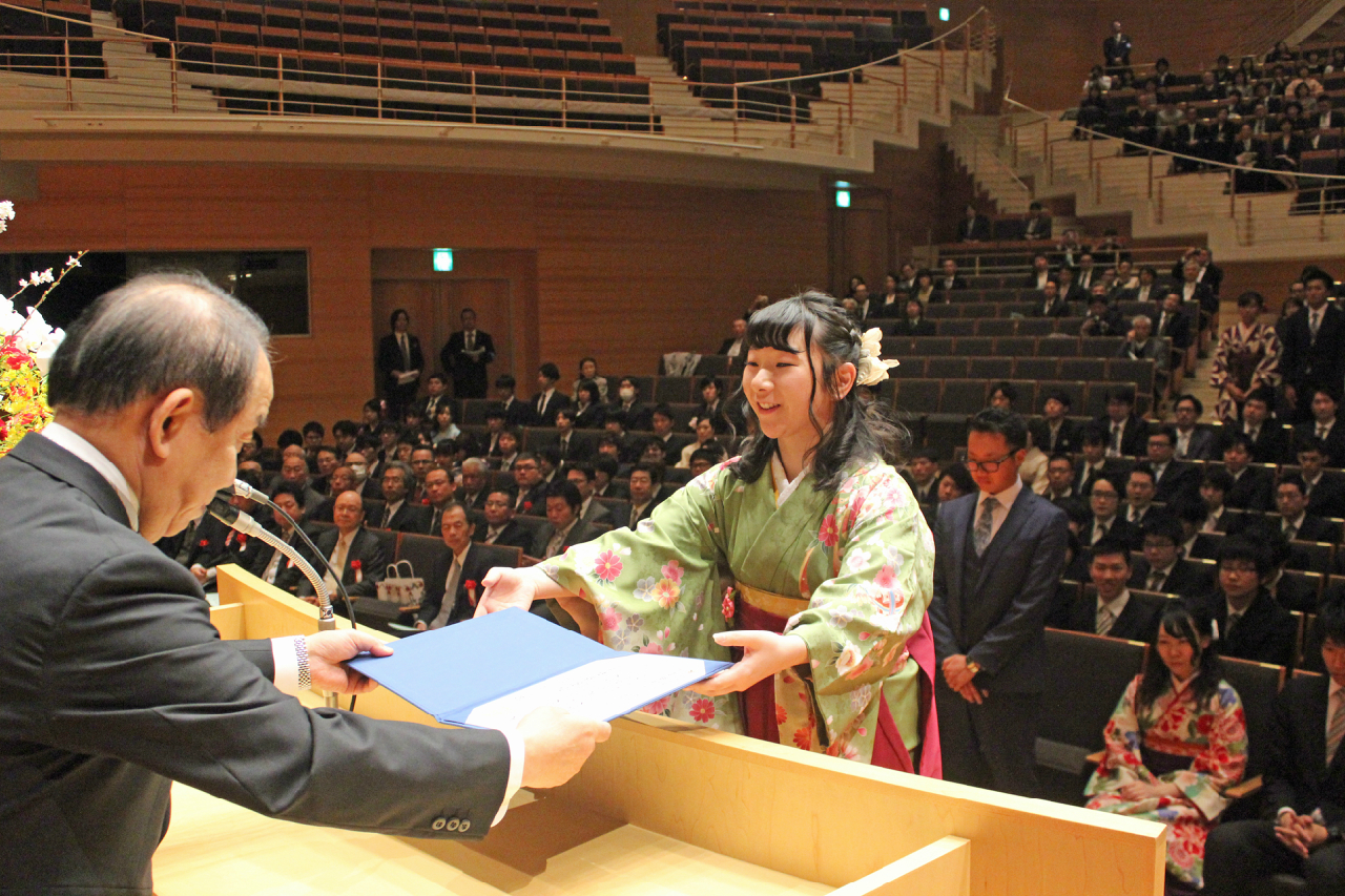 式典では先ず卒業生全員が名前を呼ばれ、一人ひとりが檀上に上がり平山学長と握手を交わしました。学長は式辞で卒業生へ向け、故 小渕 恵三 元総理大臣の『人は宿命に生まれ、運命に挑み、使命に燃ゆ』という言葉を贈り、「これから社会に船出する皆さんには、どうか強い精神を持って運命に挑戦し続け、いつか使命を見出してほしい」と激励しました。