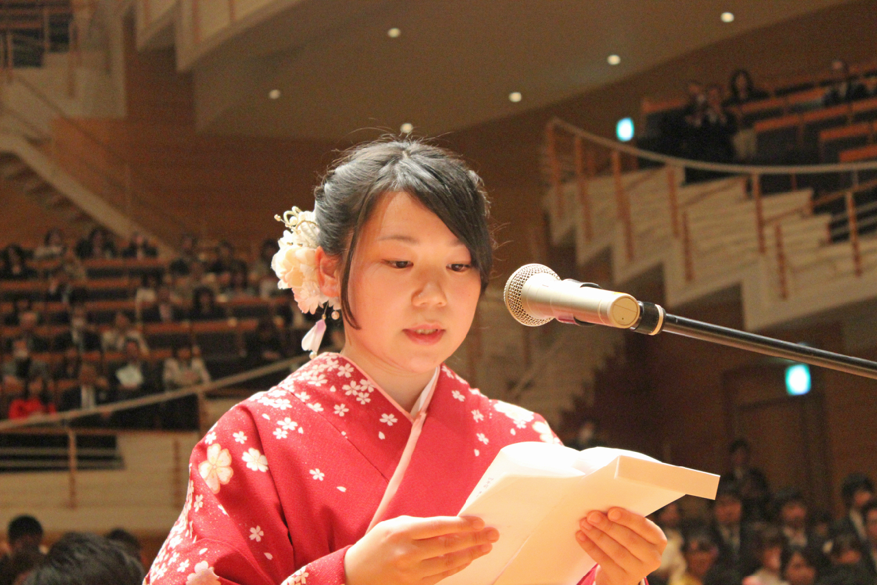 また、卒業生を代表して、大畠 玲那さん(情報文化学部 情報システム学科)が「私たちがこれから歩んでいく道には楽しいことだけではなく、辛いことも待ち受けているかもしれません。しかし、大学生活で得てきたことを糧にして、前を向いて諦めずに努力し乗り越えていきたい」と力強く答辞を述べました。