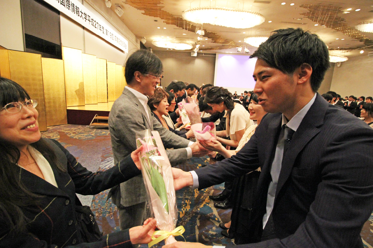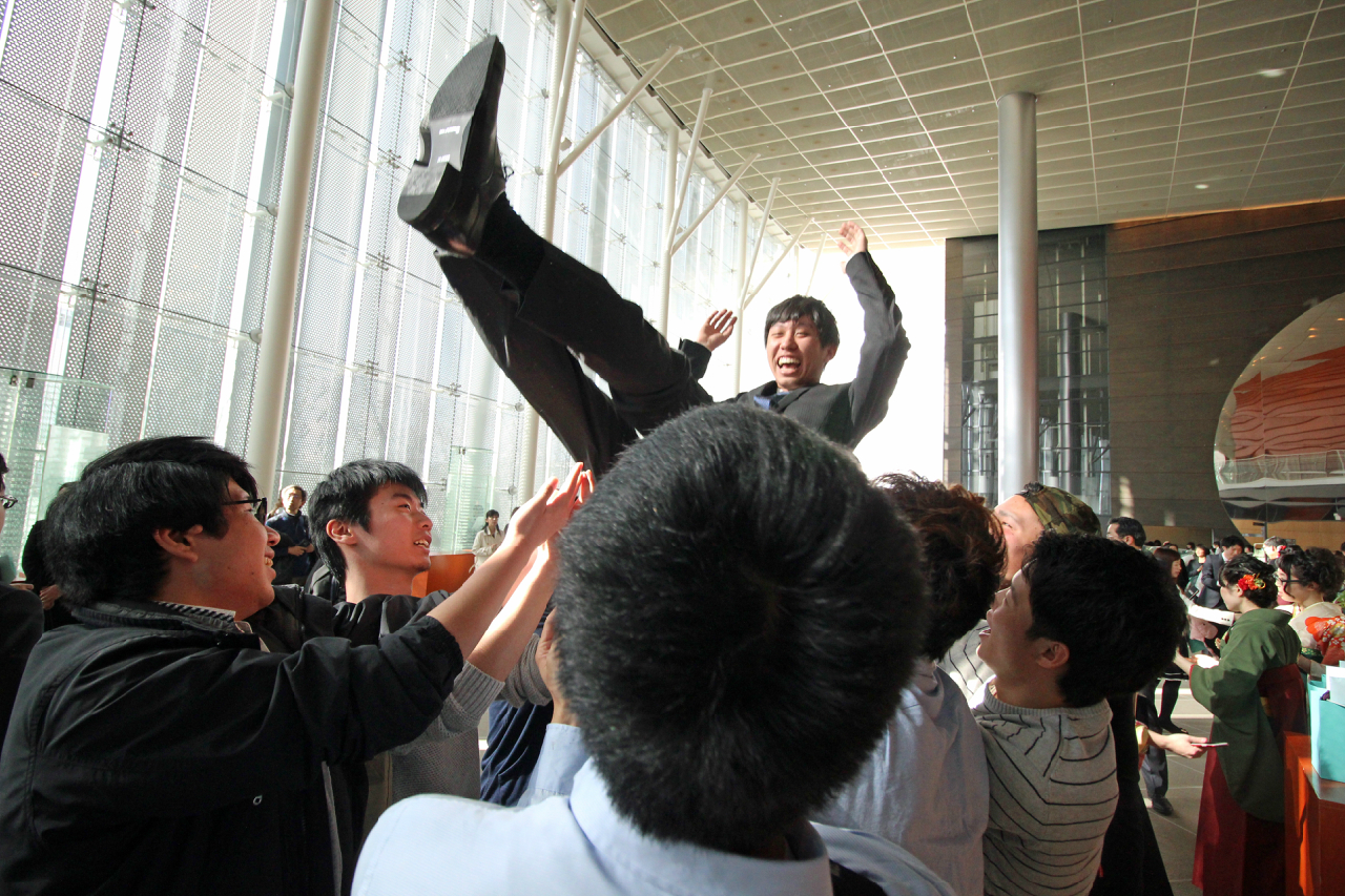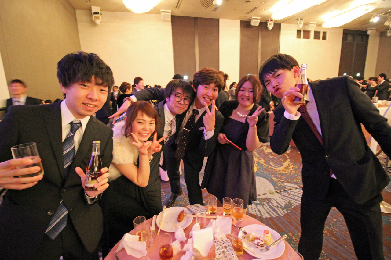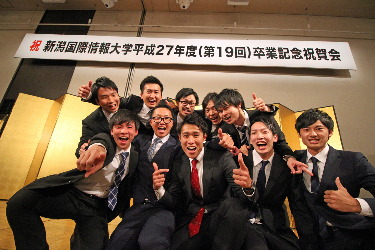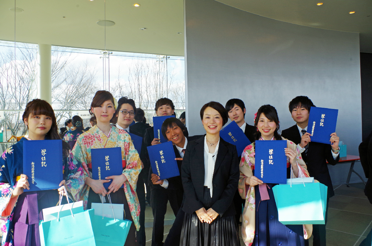 引き続いて夕方には、恒例の祝賀会がANAクラウンプラザホテル新潟で開かれ、晴れやかな笑顔いっぱいの卒業生と教職員が乾杯や記念撮影を繰り返しながら、別れを惜しみ互いの健闘を誓い合っていました。