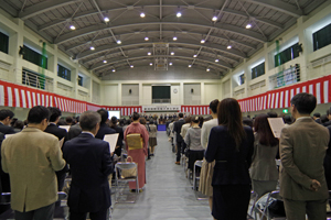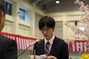 ? これに対し、新入生代表の渡邉 鉄郎 さん(情報文化学部 情報システム学科)は「より豊かで安心できる社会構築のために必要な知識や技能を大学での学びの中で身につけ、将来は情報化社会に貢献できる人間になりたい」と抱負を述べました。最後は声高らかに校歌を斉唱し、式典を終了しました。