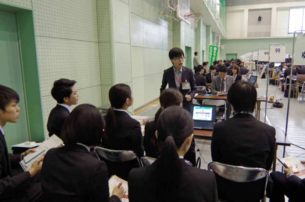 学生たちは事前説明を受けた後、説明会の会場へ移動し、志望する企業のブースへ積極的に訪問していました。
