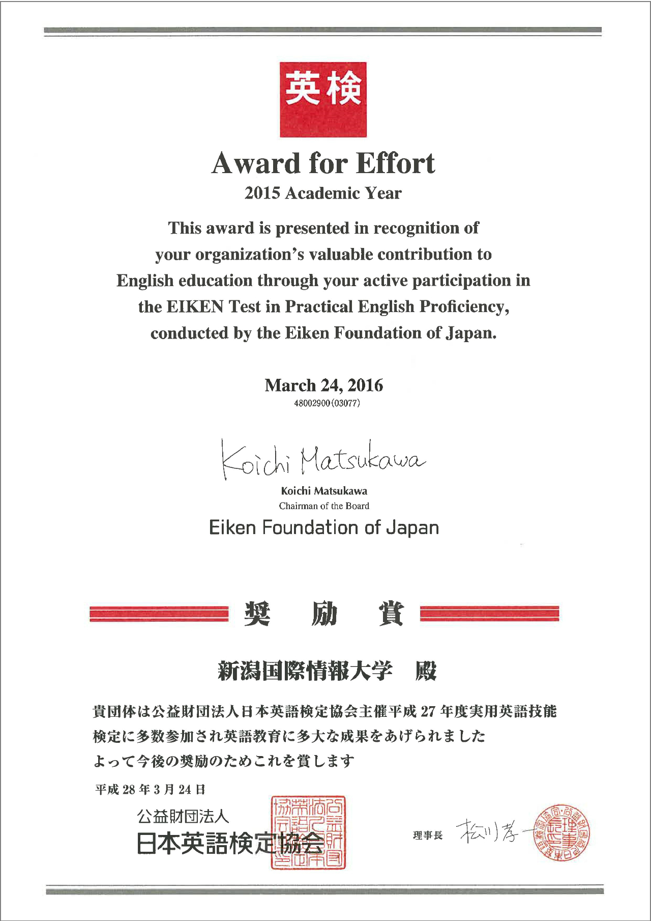 この度本学が、公益財団法人日本英語検定協会より「平成27年度奨励賞」を受賞しました。