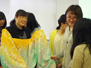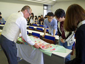 さらに、講演後にはご持参いただいた着物の生地をじかに触らせていただき、参加した学生にとって、とても貴重な経験となりました。