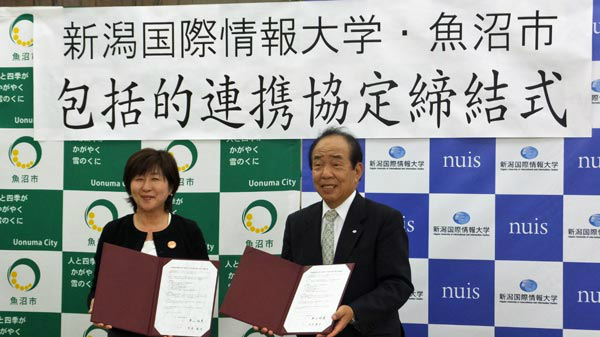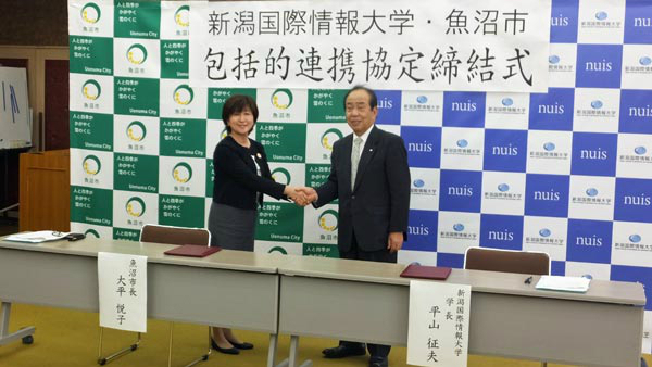 この度、本学は魚沼市と「人的・知的資源の交流及び活用を図り、相互に協力して地域と大学の発展に寄与する」ことを目的に包括的連携協定を結び、その締結式が魚沼市役所において平成28年5月30日(月)に執り行われました。