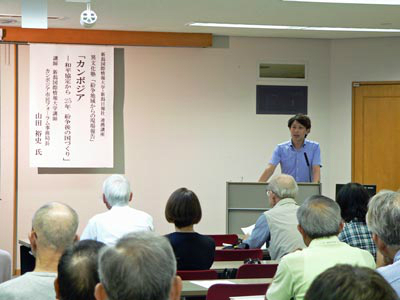 本講演は新潟日報社と本学による連携講座・異文化塾「紛争地域からの現場報告」の一環として開かれ、山田講師は約100名の参加者を前に、カンボジアの政治や社会情勢の現状、今後の課題について講演を行いました。