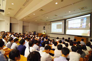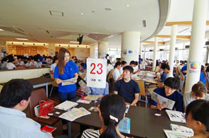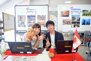 その他、入学試験の説明会、保護者対象説明会、参加者が気軽に立ち寄れる入試・進学相談コーナーが設置され、入試情報や奨学金等について、参加者は熱心に質問をしていました。また、就職個別相談をアットホームなカフェスタイルで行なう「キャリアカフェ」がオープンし、在学生や本学卒業生らが、就職活動に関する経験談や学生生活の思い出話などを披露しました。海外留学相談コーナーでは、本学の特色の1つである派遣留学制度・夏期セミナー(アメリカ・ロシア・中国・韓国・カナダ)で実際に留学を体験した学生から、制度の特色や海外生活の体験談が語られました。