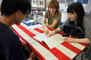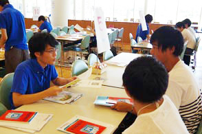 実験体感コーナーや海外留学相談コーナーが設置されたほか、参加者が気軽に立ち寄れる入試・進学相談コーナーでは入試情報や奨学金等について、参加者は熱心に質問をしていました。また、就職個別相談をアットホームなカフェスタイルで行う「キャリアカフェ」がオープンし、在学生スタッフが、就職活動に関する経験談や学生生活の思い出話などを披露しました。