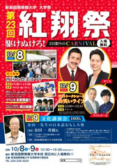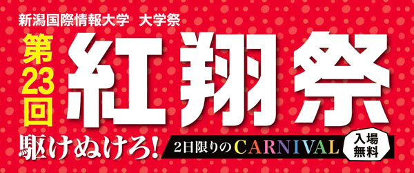 平成28年10月8日(土)・9日(日)の2日間、本校(みずき野キャンパス)にて、第23回「紅翔祭(大学祭)」を下記のとおり開催いたします。テーマは、「駆け抜けろ!~2日限りのCARNIVAL~」です。今年も模擬店、文化講演会など楽しいイベントが目白押しとなっております。入場無料ですので、ご家族、ご友人等お誘いのうえ、どなたでもぜひご来学ください。
