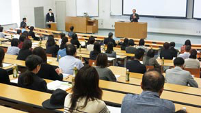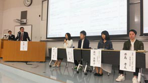 はじめに、平山 征夫学長、内田 亨キャリア支援委員長から冒頭の挨拶があり、続いて西脇 茂雄キャリア支援課長から「本学の就職活動支援の取り組みと現状」について講演後、「親と子のコミュニケーション~就職活動を振り返って~」をテーマに、本学卒業生及び4年次生の内定者を交えたパネルディスカッション、質疑応答が行われました。