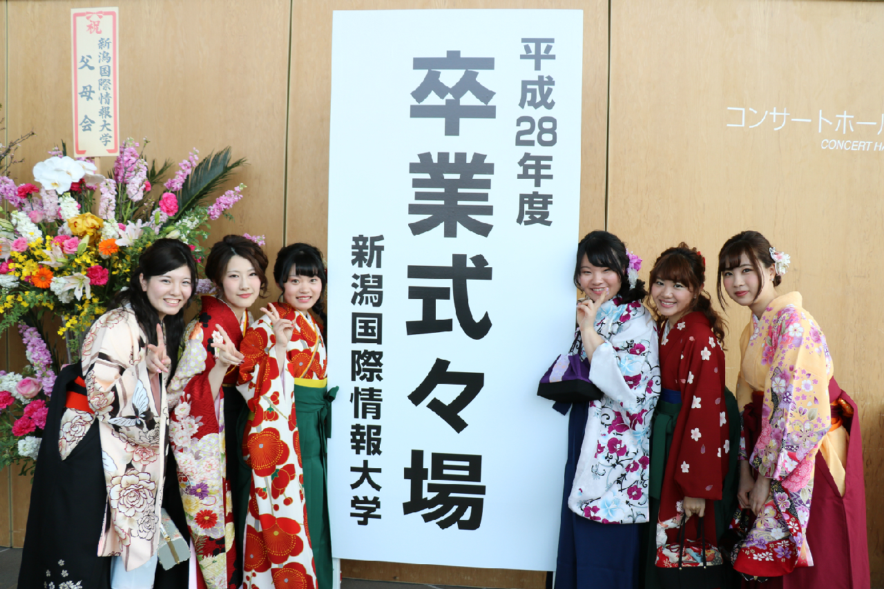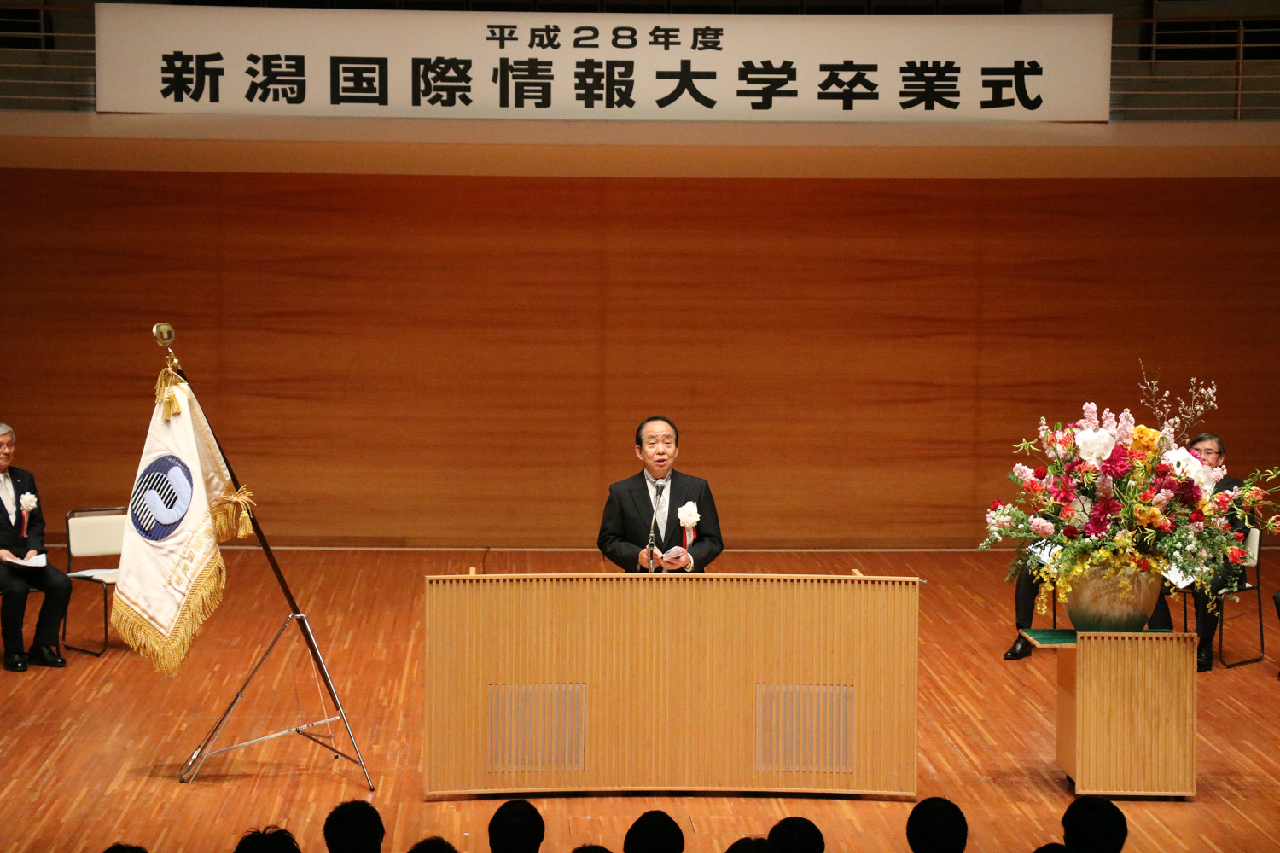 今年で第20回となる本学の平成28年度卒業式が3月20日、新潟市民芸術文化会館(りゅーとぴあ)コンサートホールで行われ、卒業生286人(情報文化学科113人、情報システム学科173人)が、夢と希望を胸に新社会へ羽ばたきました。