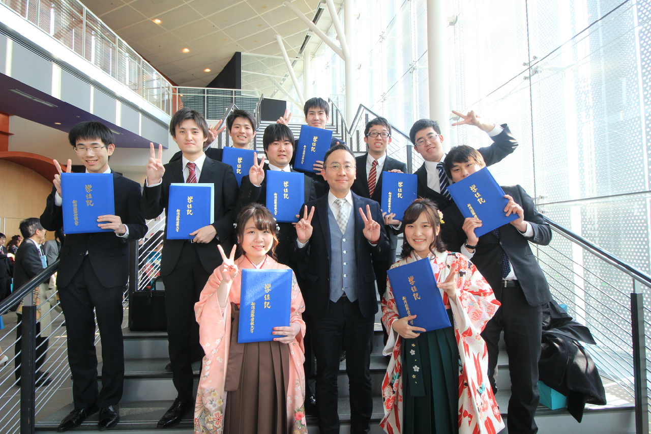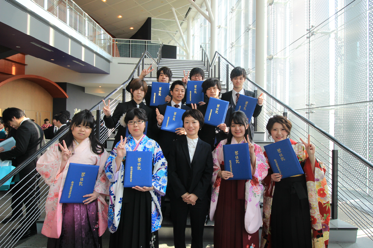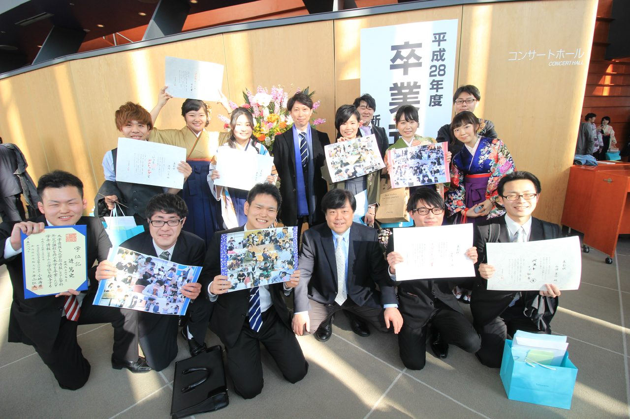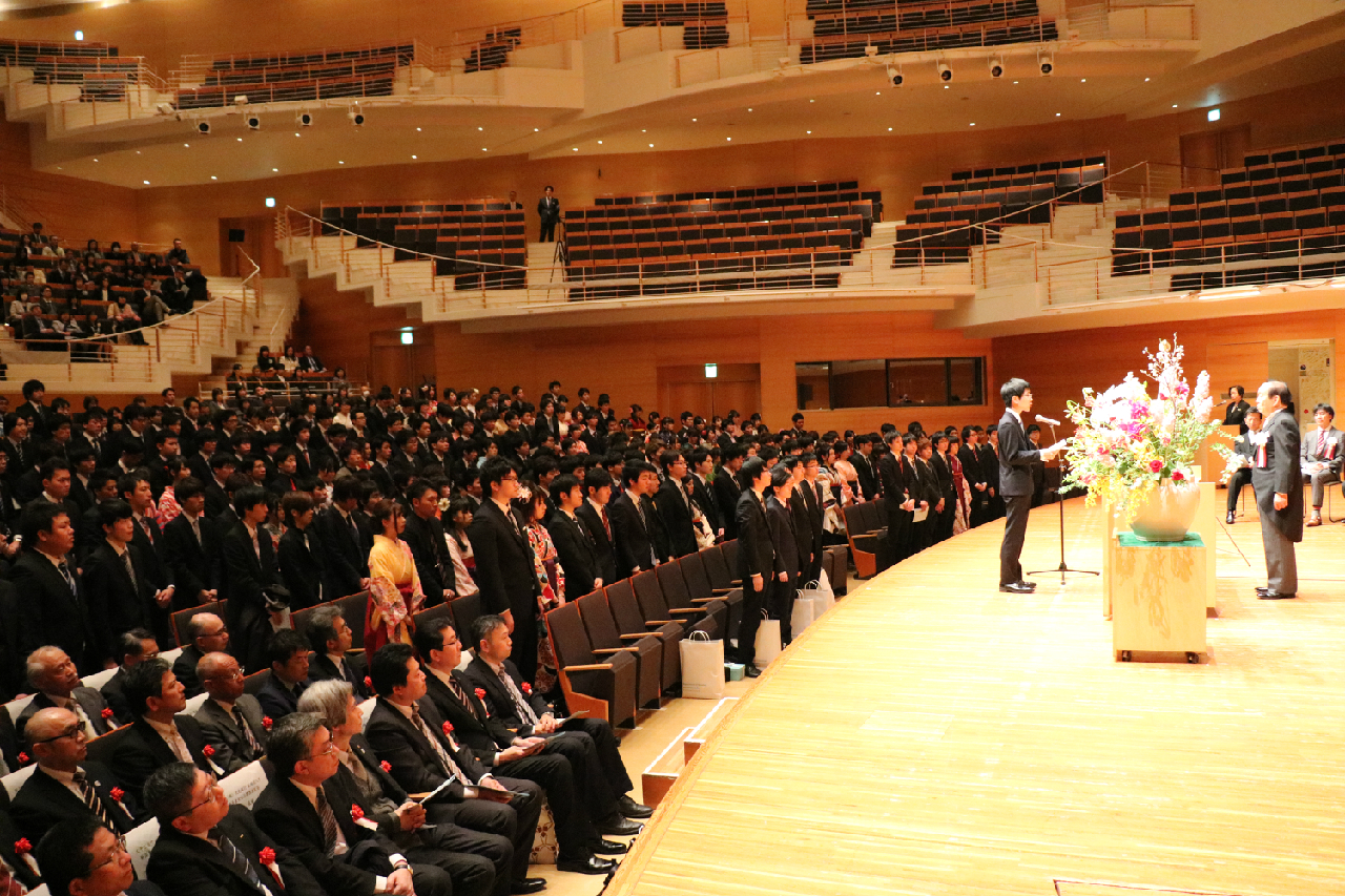 最初は学位記授与式。学部長から卒業生一人ひとりが名前を高らかに呼ばれて登壇し、平山征夫学長が「おめでとう」と握手で祝福。式辞で平山学長は「世界は政治、経済とも厳しい不確実性の時代。皆さんは大海に乗り出す小舟ですが、学問は必ず役立ちます。賢い思考と判断力、大きな勇気を持ち、良き社会人、地域人として学び続け、一度しかない人生、全力を尽くしてください」と激励しました。