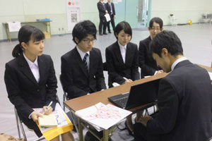 学生たちは事前説明を受けた後、説明会の会場へ移動し、志望する企業のブースへ積極的に訪問していました。