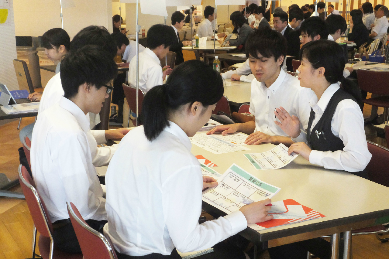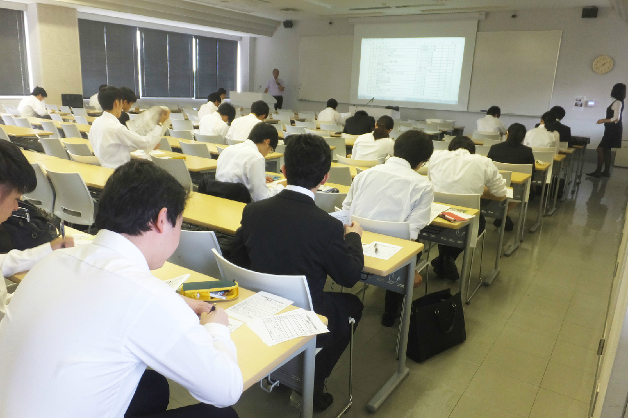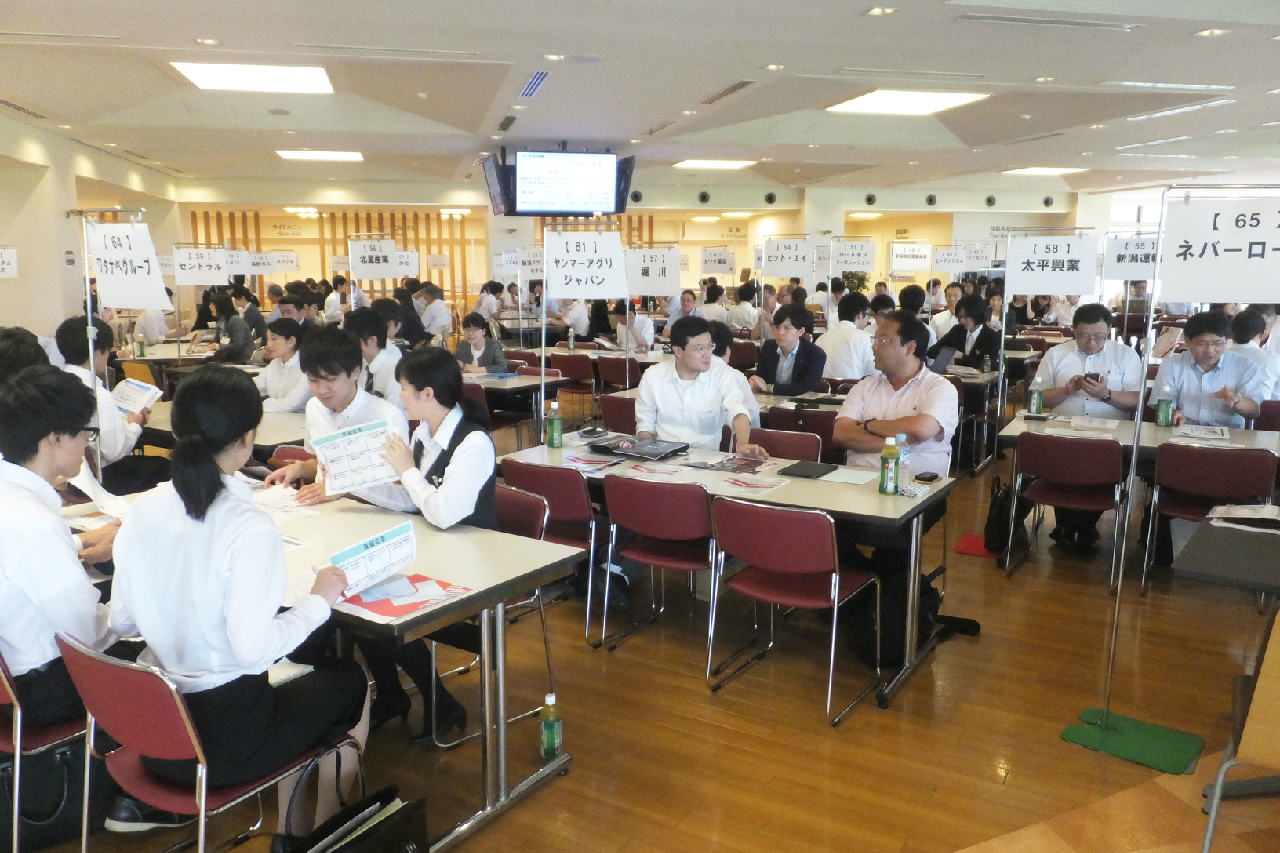 平成29年7月12日(水) 本校(みずき野キャンパス)にて、就職活動中の4年次生を対象とした「学内合同企業説明会」を実施しました。県内外より65社の企業様にお越しいただき、仕事内容や今後の選考についてご説明いただきました。エントリーした48名の学生は、真剣な表情で担当者の話に耳を傾けていました。