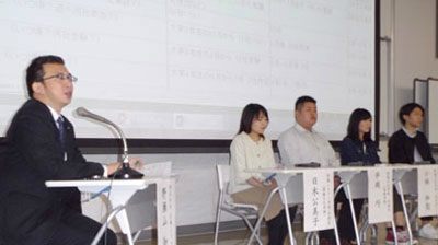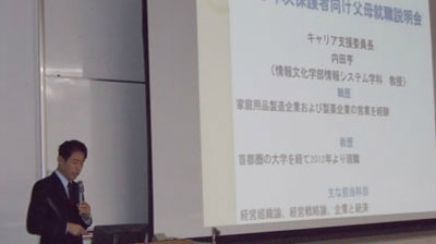 はじめに、内田 亨キャリア支援委員長から冒頭の挨拶があり、続いて西脇 茂雄キャリア支援課長から「本学の就職活動支援の取り組みと現状」について講演後、「ご家族に知ってほしいリアル就職活動」をテーマに、本学卒業生及び4年次生の内定者を交えたパネルディスカッション、質疑応答が行われました。