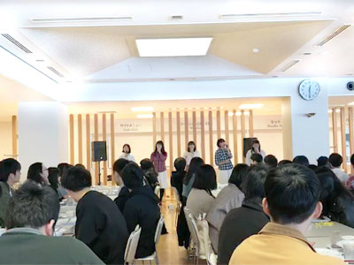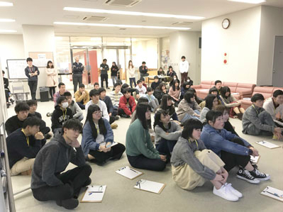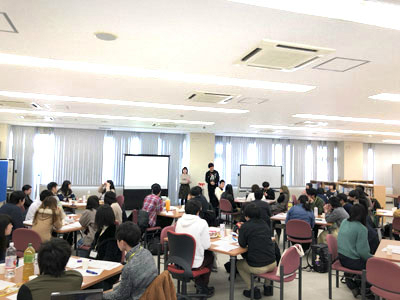 当日は41名が参加し、午前の部、午後の部の二部構成で実施されました。午前の部は、在学生と新入生の交流を目的にアイスブレークのアクティビティを実施、新入生の4月までの宿題である自宅学習パックのための勉強会(在学生が教えます!)やこれからの大学生活についての相談会を開催しました。ランチタイムではアカペラサークルのライブやフェアトレードを進める学生サークルの紹介がありました。午後の部は3チームにわかれ、日本での外国人差別について、世界の民族について、世界の識字率について、ワークショップを行いました。3つそれぞれのワークショップには本学教員によるショートレクチャーが組み込まれていました。途中、休憩を取り、参加者全員で、羽生結弦さんが金メダルを取ったフィギュアスケート男子の中継をパブリックビューイングのような形で観て応援し、大いに盛り上がっていました。