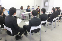 午前中は、“伝える”、“伝わる”コミュニケーションを集団の中で実践する「グループディスカッション対策」と「面接マナー」について学び、午後からはグループに分かれ、社会人、卒業生、4年次生が面接官となり本番に近い面接の実践練習を行いました。3年次生自身も面接官や観察者の立場になって面接を行うことで、視点を変えて「面接実践練習」を体験しました。