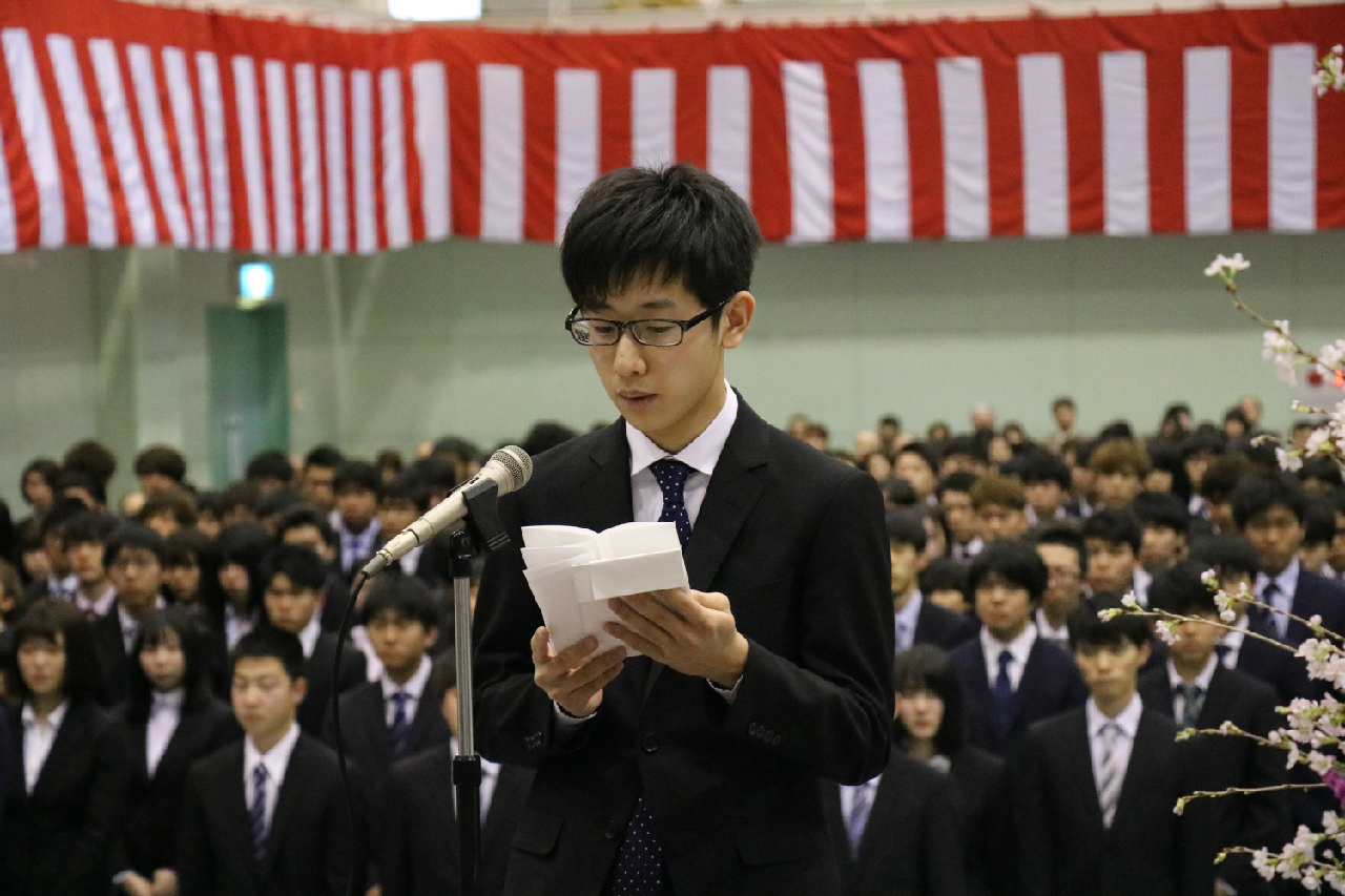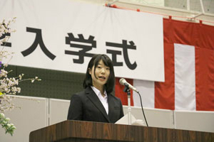 在学生を代表して情報システム学科の佐藤紘子さんが「責任を持って自ら考えて行動し、人との関わりや繋がりを広げ、楽しむ心を持ち続けてください」と歓迎の言葉を述べました。これに対し、新入生を代表して経営学科の稲葉圭太さんが「向上心を持って勉学やサークル活動などに取り組みます。大学生活で大きく成長したい」と抱負を述べました。