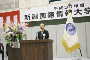 新学長として4月1日に就任した野崎茂学長は「豊かな人間性と高い専門分野を極める努力を惜しまず、哲学、文学、音楽などのリベラルアーツも学び、留学などを含め学外にも活動の場を広げ、自らの目標を定めて主体的に学んでください」と祝辞を贈りました。