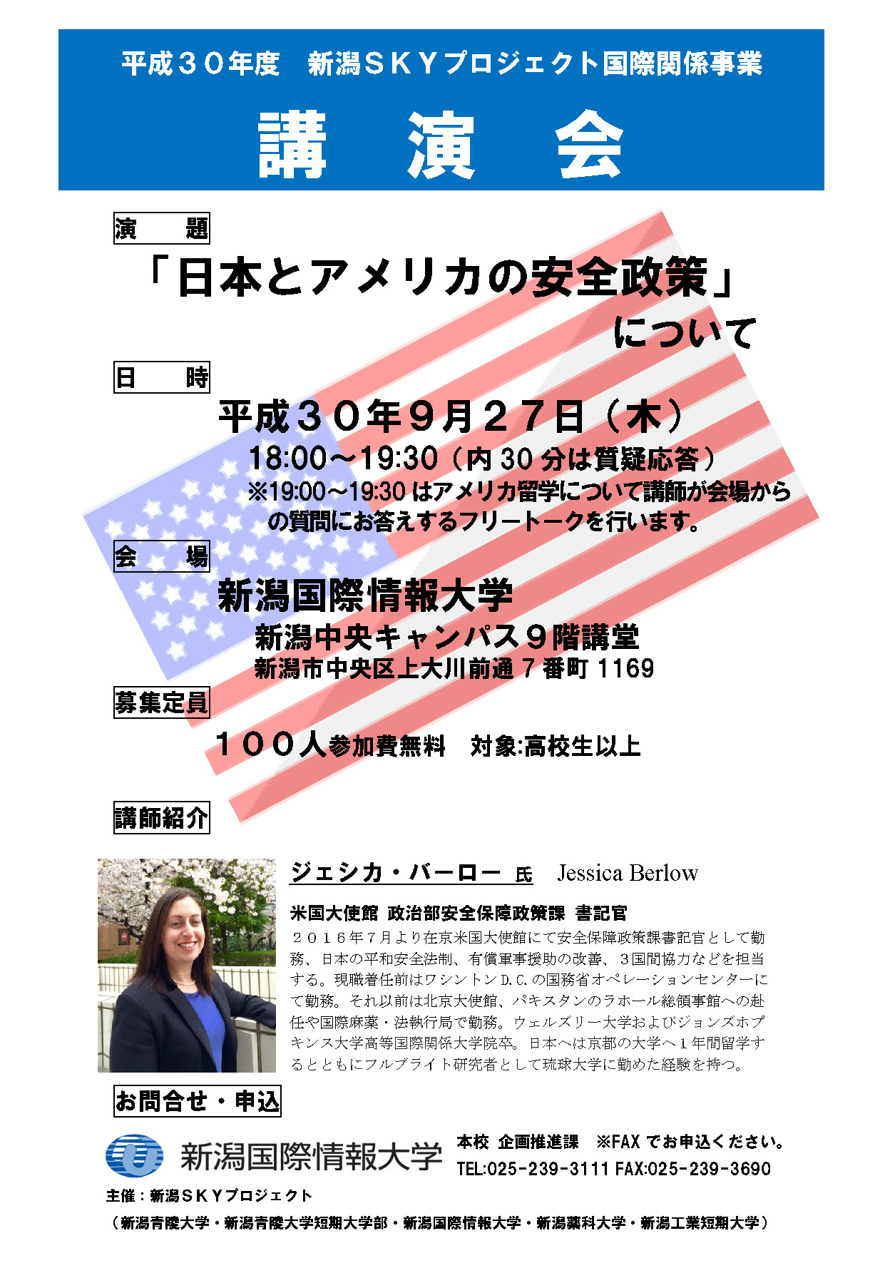 平成30年9月27日(木)本学新潟中央キャンパスを会場に米国大使館政治部安全保障政策課書記官をお招きして、講演会を開催します。