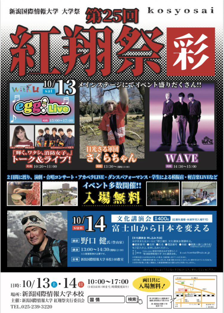 平成30年10月13日(土)・14日(日)の2日間、本校(みずき野キャンパス)にて、第25回「紅翔祭(大学祭)」を下記のとおり開催いたします。テーマは、「彩」です。今年も模擬店、文化講演会など楽しいイベントが目白押しとなっております。入場無料ですので、ご家族、ご友人等お誘いのうえ、どなたでもぜひご来学ください。