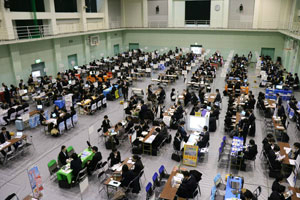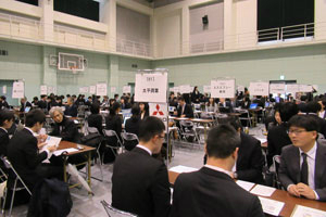 学生たちは事前説明を受けた後、説明会の会場に移動し、志望する企業のブースへ積極的に訪問していました。