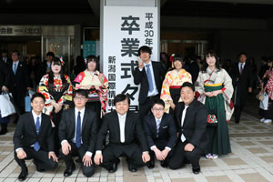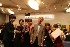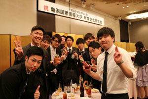 引き続き夕方には、恒例の祝賀会がANAクラウンプラザホテル新潟で開かれ、晴れやかな笑顔いっぱいの卒業生と教職員が乾杯や記念撮影を繰り返しながら、別れを惜しみ互いの健闘を誓い合っていました。