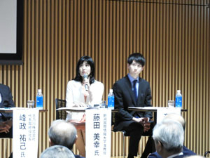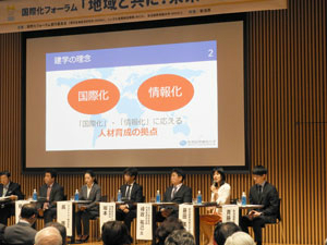 第二部では、各団体が今まで取り組んできた活動・事例の発表とパネルディスカッションを行い、本学からは、経営情報学部 経営学科 藤田美幸 准教授(地域連携委員長)と情報システム学科4年 斉藤一貴さんが参加。活動・事例の発表では、本学の国際化・地域連携の取り組みについて発表し、パネルディスカッションでは今後の国際化について各々の立場から考えを述べました。